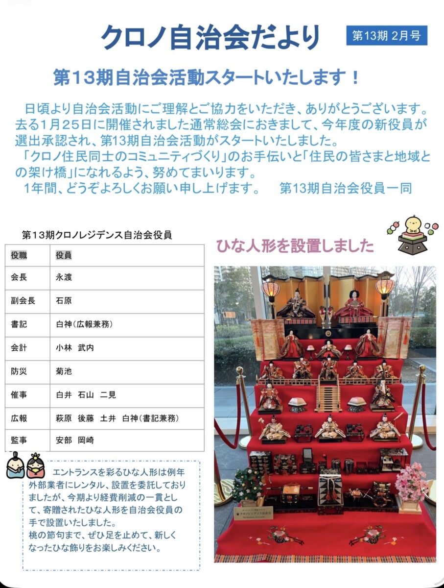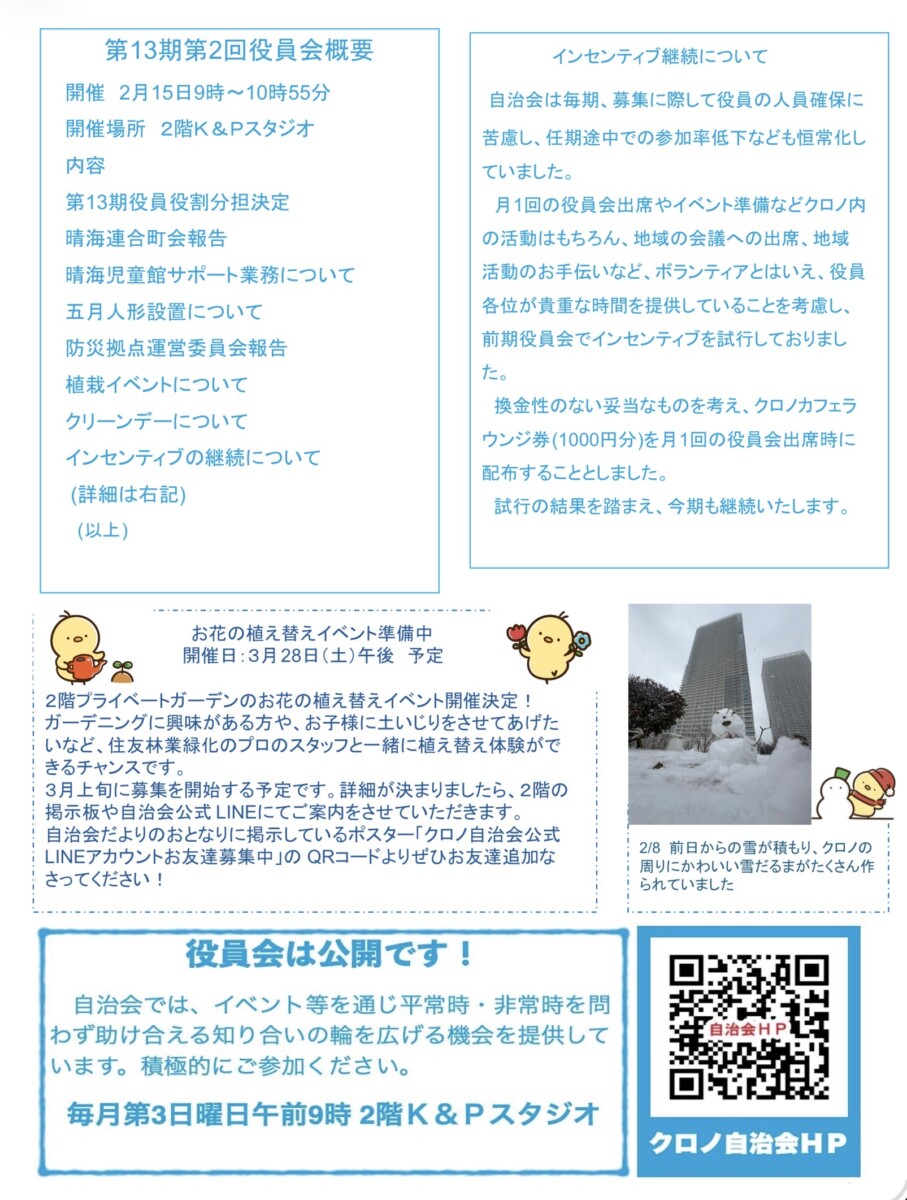 注目情報 一覧 25/10/31 | クロノ自治会公式LINEアカウント運用スタート!25/09/03 | 晴海ライナーと東京BRTがダイヤ改正 9月16日25/07/23 | 江戸バスが減便、土休日は30分間隔に 2025年8月2日から24/02/01 | 【中央区】粗大ごみ申し込み先は3月2日から変更 *動画配信チャンネル* イベント動画(YOUTUBE) お知らせ 一覧 26/02/20 | 自治会だより 第13期2月号を発行いたしました26/02/03 | はるみーな(晴海児童館のお知らせ)2026.2月号発行26/02/03 | 自治会だより 第13期1月号を発行いたしました25/12/28 | 自治会だより 第12期12号を発行しました25/11/24 | 自治会だより 第12期11号を発行しました 防災会・防災 一覧 25/09/03 | お知らせ 防災ニュースはmcloudへ24/08/15 | 南海トラフ地震、特別な注意の呼びかけは終了 日頃の備えの再確認を24/08/01 | 中央区クーリングシェルター 中央区より 一覧 25/03/22 | 【中央区】オンライン手続きポータルサイトのお知らせ24/08/01 | 中央区クーリングシェルター24/07/05 | 晴海図書館openしました!!24/02/01 | 【中央区】粗大ごみ申し込み先は3月2日から変更24/01/10 | はるみーな(晴海児童館のお知らせ)1月号発行 クロノフォトギャラリー 一覧 25/09/11 | 2025年9月のクロノレジデンス24/10/11 | 2024.10のクロノレジデンス24/08/26 | 2024.8のクロノレジデンス(上空から)