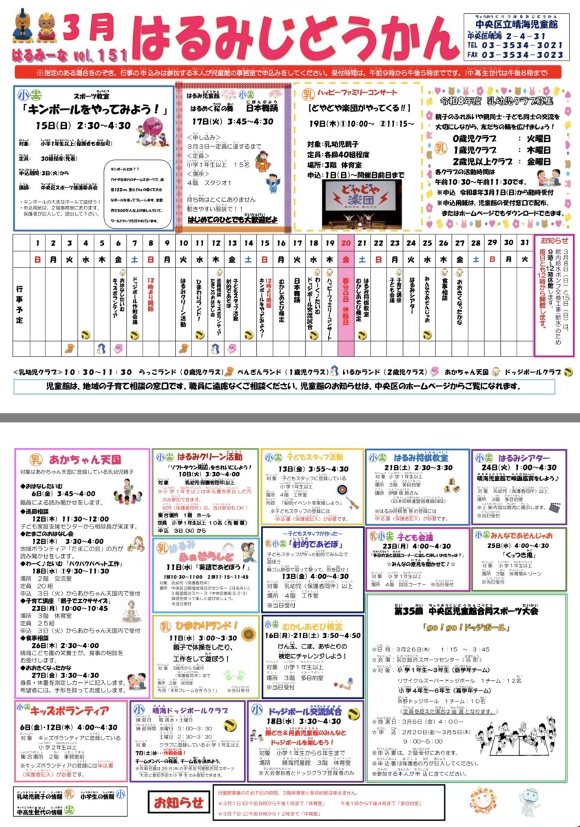 注目情報 一覧 25/10/31 | クロノ自治会公式LINEアカウント運用スタート!25/09/03 | 晴海ライナーと東京BRTがダイヤ改正 9月16日25/07/23 | 江戸バスが減便、土休日は30分間隔に 2025年8月2日から24/02/01 | 【中央区】粗大ごみ申し込み先は3月2日から変更 *動画配信チャンネル* イベント動画(YOUTUBE) お知らせ 一覧 26/03/07 | はるみーな(晴海児童館のお知らせ)2026.3月号発行26/02/20 | 自治会だより 第13期2月号を発行いたしました26/02/03 | 自治会だより 第13期1月号を発行いたしました25/12/28 | 自治会だより 第12期12号を発行しました25/11/24 | 自治会だより 第12期11号を発行しました 防災会・防災 一覧 25/09/03 | お知らせ 防災ニュースはmcloudへ24/08/15 | 南海トラフ地震、特別な注意の呼びかけは終了 日頃の備えの再確認を24/08/01 | 中央区クーリングシェルター 中央区より 一覧 25/03/22 | 【中央区】オンライン手続きポータルサイトのお知らせ24/08/01 | 中央区クーリングシェルター24/07/05 | 晴海図書館openしました!!24/02/01 | 【中央区】粗大ごみ申し込み先は3月2日から変更24/01/10 | はるみーな(晴海児童館のお知らせ)1月号発行 クロノフォトギャラリー 一覧 25/09/11 | 2025年9月のクロノレジデンス24/10/11 | 2024.10のクロノレジデンス24/08/26 | 2024.8のクロノレジデンス(上空から)
