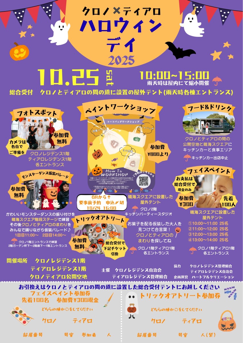クロノ×ティアロ ハロウィンデイ2025 チラシ 全戸配布しました 25/10/13 クロノ×ティアロ ハロウィンデイ2025 チラシ 全戸配布しました チラシを持って遊びに来てね 皆さまのご参加お待ちしています!